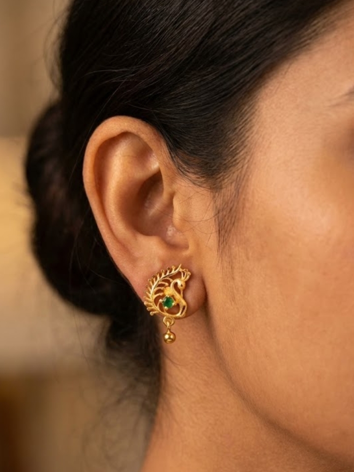 These Emerald Green Peacock Stud Earrings add beauty to any traditional outfit. Crafted with intricate peacock detailing and a soft gold finish, these earrings are suitable for daily wear as well as festive occasions.