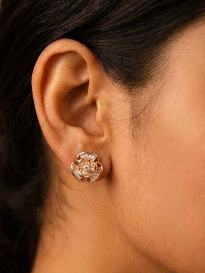 These stunning Floral CZ Stud Earrings feature a radiant rose-gold plating paired with dazzling stones arranged like blooming petals. Their classic floral design adds a feminine charm, making them a perfect accessory for daily office wear, college, or traditional events. Lightweight and skin-friendly for all-day comfort.
