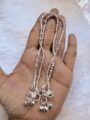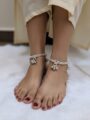 Add a touch of timeless beauty to your look with these silver covering anklets (payal). Designed with intricate craftsmanship, these anklets feature a smooth chain pattern and small ghungroo charms that make a soft, pleasant sound.