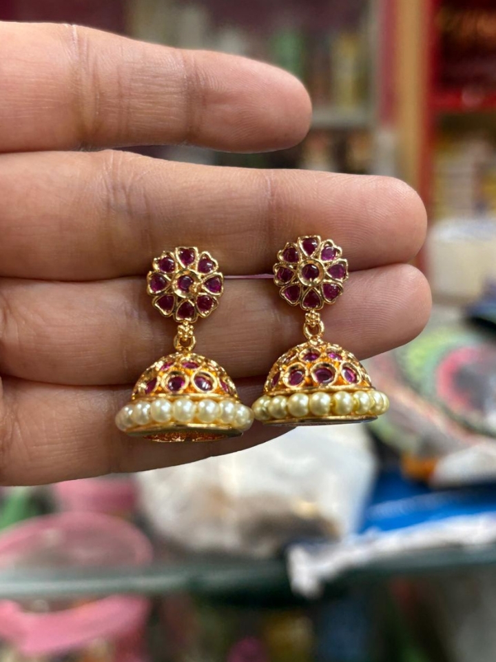 These beautifully crafted traditional jhumka earrings are designed with intricate gold plating and adorned with vibrant ruby-colored stones. The floral stud top is highlighted with ruby accents, while the dome-shaped jhumka is embellished with tiny pearls along the base, giving it a timeless ethnic appeal. Lightweight and comfortable, these earrings pair effortlessly with sarees, lehengas, salwar suits, and festive attire—ideal for weddings, celebrations, and cultural events.